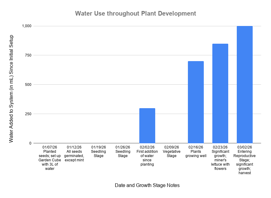Here’s a chart of the water usage since initial planting. It better displays the plants’ low initial water use during germination and seedling growth, which then quickly accelerates as the plants grow leaves in the vegetative stage. It would be neat to attach a photo to each date.